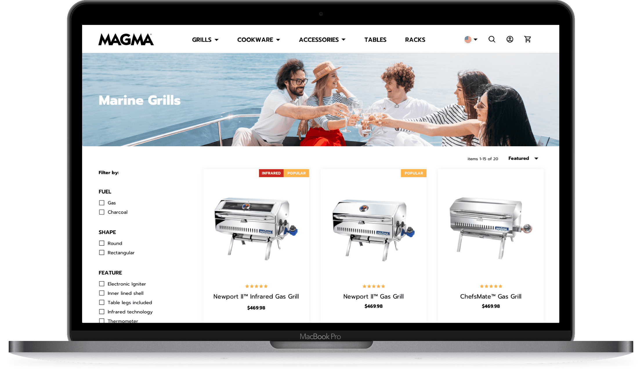 When you need to grill on the go, Magma has the products. Designed for boaters and outdoor enthusiasts, their grills are industry leading but their website experience wasn’t telling the story. Magma came to ATF with concerns about their lack of D2C sales despite their success in the market as the leading manufacturer of marine grills. Their poorly designed website was leaving potential customers with more questions than answers and abandoning their carts during the frustrating checkout experience. We understood their vision and set out to create a new modern ecommerce website that could improve conversions, elevate the customer experience, and support Magma’s long-term goal of expanding into new markets, including RV and camping grills.