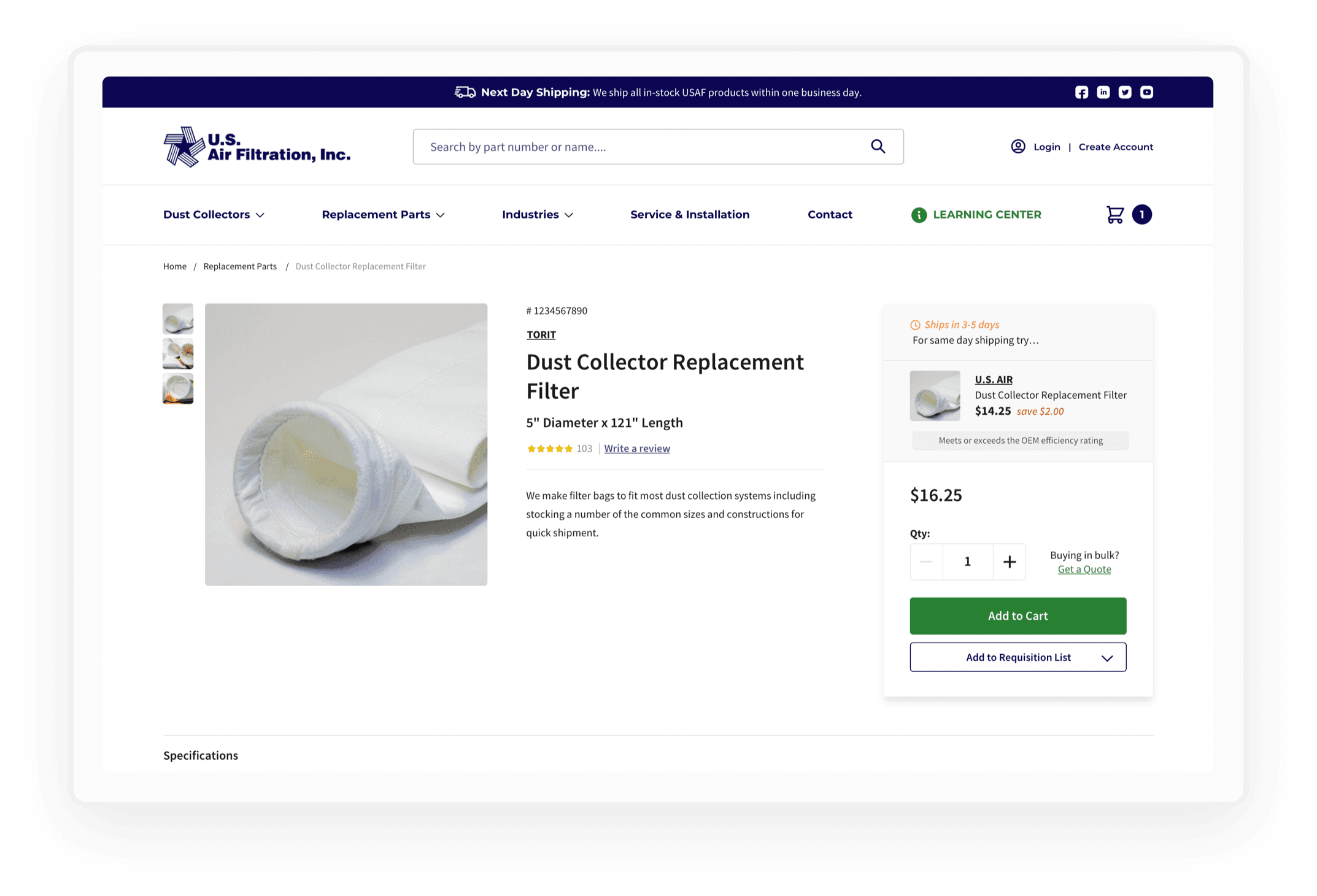 U.S. Air Filtration, a major player in the air pollution control industry, has a mission to help their customers achieve peak production in their facilities by providing exceptional service, products, and expertise in air pollution control. To further that mission, the B2B manufacturer came to Above The Fray ready to invest in their first ecommerce website to enable their customers to transact online.
